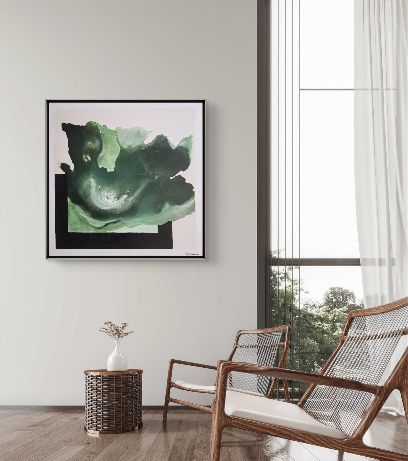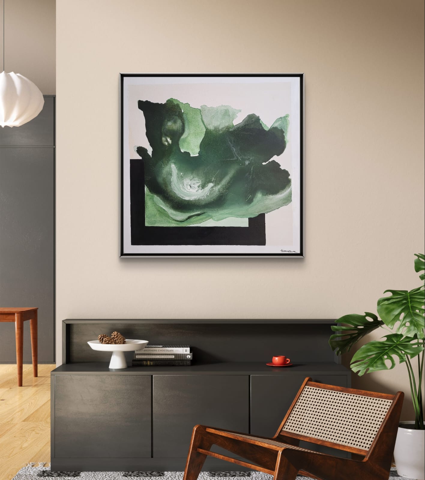 The swirling center glows with light green highlights and shadowy folds, drawing the viewer inward as though into a mysterious forest or the depths of the ocean. It captures a sense of calm introspection, perfect for minimalist interiors seeking a focal point that soothes yet provokes thought.