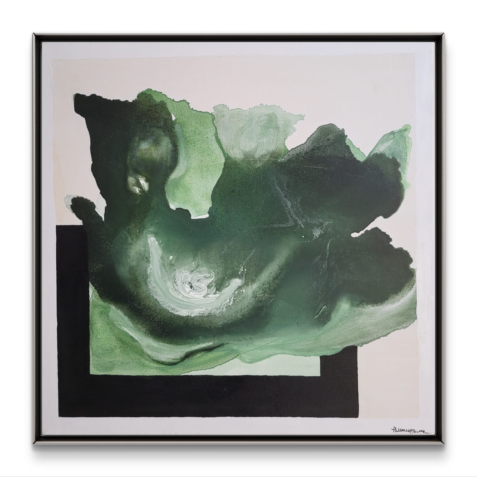 Surrounding the organic form is a strong black rectangular base, grounding the fluidity and adding a contrast of structure against the spontaneity of the brushwork. This interaction between rigid geometry and natural flow highlights the theme of balance—between control and freedom, stillness and motion.