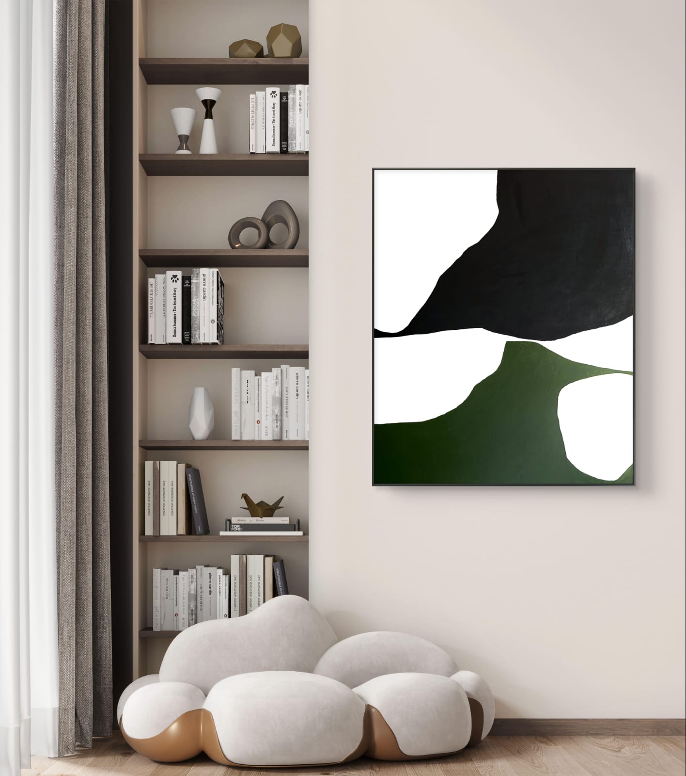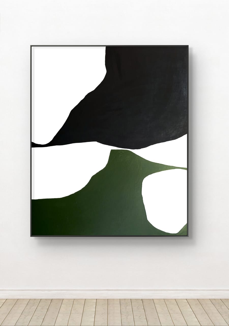 “Harmony in Layers” is a minimalist abstract painting that reflects balance, flow, and the quiet power of nature through its fluid shapes and earthy palette. The canvas is divided into smooth, organic sections of deep black, rich forest green, white, and light green, creating a sense of movement and layered depth without the need for intricate detail.